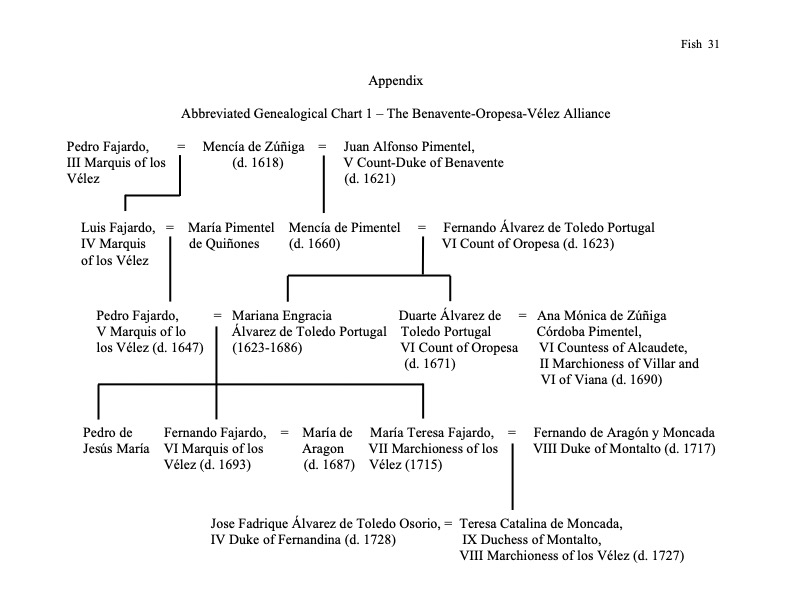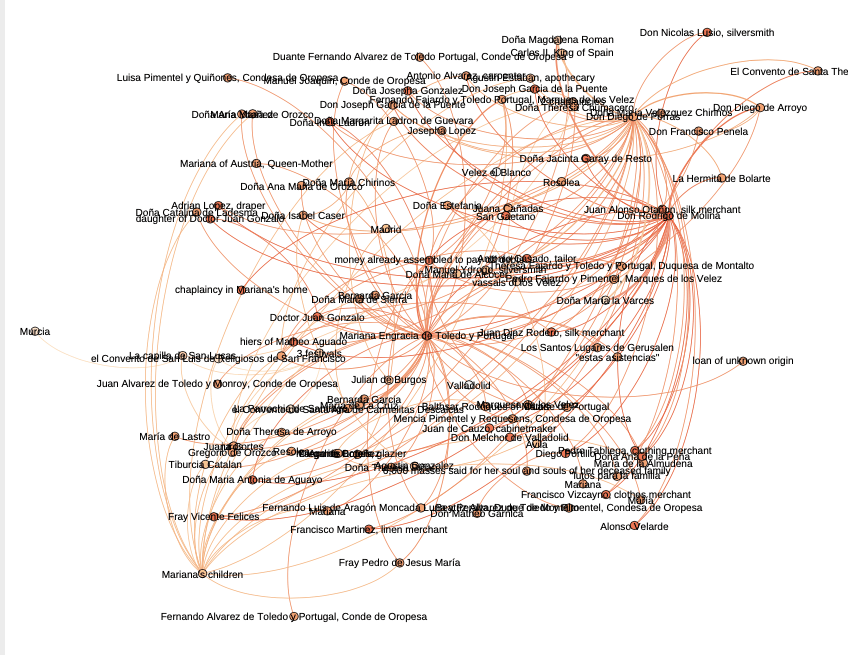 This project examines the social network performed through the selection and dispensation of assets in the 1685 testament of Mariana Engracia Álvarez de Toledo Portugal, Marquise of los Vélez. Testaments were powerful financial, legal, and religious documents in early modern Spain. Individuals utilized testaments to dispose of their worldly goods on the occassion of their death, ensuring the proper inheritance of valuable assets to individuals within their social and familial networks. As a woman at the pinnacle of Spanish society and courtly politics, Mariana Engracia’s testament underscores the value of familial and political connections alongside a distinctive feminine power circle at the heart of the Fajardo and Álvarez de Toledo families in the late seventeenth century. Analysis of the social network revealed through the testamentary bequests reveal the centrality of her daughter María Teresa Fajardo, Duchess of Montalto (see portrait by Martínez de Mazo), her sister-in-law Ana Mónica de Zúñiga Córdoba, Countess of Oropesa, her daughter-in-law María de Aragón, Marquise of los Vélez, and her niece Isabel Pacheco. The material goods these four women received emphasize the valuable assets each brought to the family lineage: their aristocratic motherhood, their social capital, and their dedication to the family.